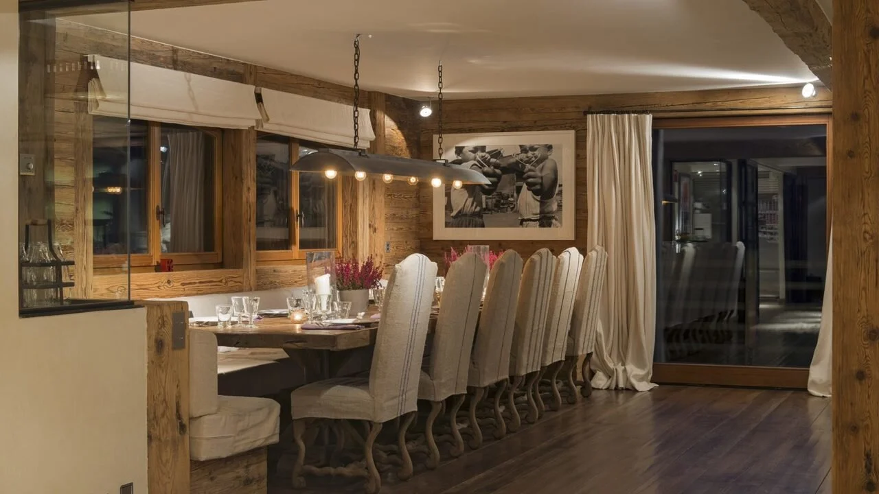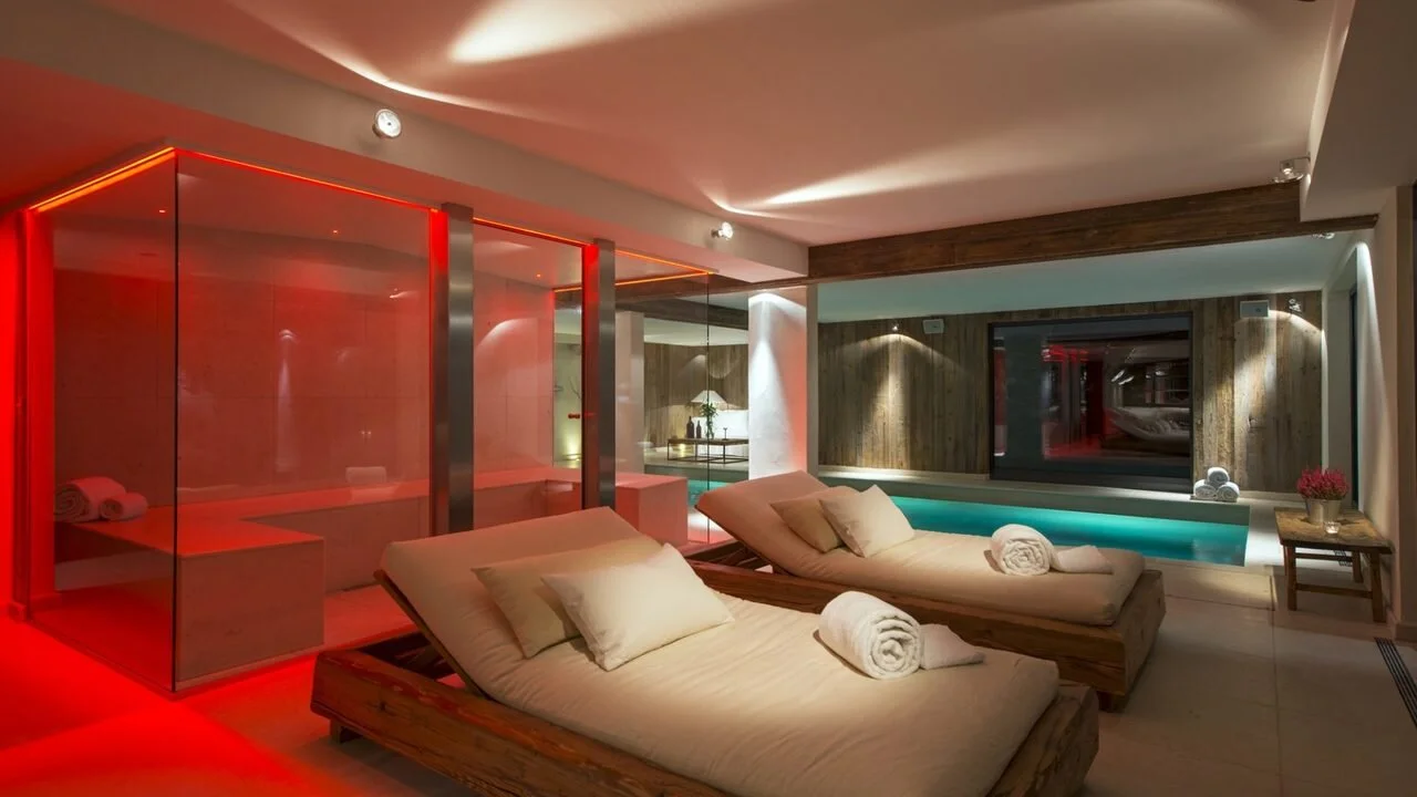 The top floor of the chalet is dedicated to the impressive master bedroom with a roll-top bath, shower room, dressing area, and lounge space with fireplace and private balcony. The floor below has a further five bespoke-designed bedrooms - three double en-suite bedrooms with balcony access, a children's room with two sets of delightful hand-crafted bunks sleeping four, and an en-suite bedroom with a queen-sized bed. The main entrance of the chalet is on the second floor with an elegant open plan dining area seating and extensive kitchen. Relax altogether in the exceptional living room with an open fireplace. The lower two floors of the chalet are home to the personal spa and entertainment areas. The 8 x 3 metre swimming pool has swim jets or there is relaxing in the glass hammam or toned up in the spacious gym. An outdoor hot tub, bar area, and cinema room will keep you entertained throughout your stay.