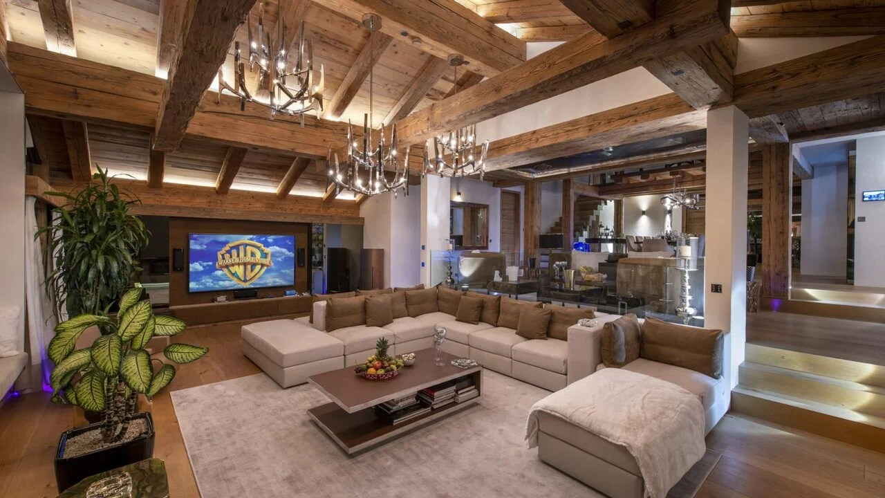 The top floor of the main chalet is dedicated to the two impressive master bedroom suites. The bedrooms have king-sized beds, small living areas with open fireplaces, an en-suite shower room in one and bathroom in the other, and a walk-in wardrobe. They both have private balconies with breath-taking views of the snow-covered alps. On the first floor, there is the split-level open plan living and dining area with double height ceiling. During the day, the room is bathed in sunlight and has large sliding doors with access to the wrap-around balcony. There are also four en-suite bedrooms. The entire ground floor in the main chalet is dedicated to entertainment. 17m indoor swimming pool and sunken outdoor hot tub. There is a well-equipped gym, sauna, hammam, bar and billiards area, gaming room, poker room with panoramic wine cellar, games area, and an extraordinary bowling alley. There is also a large professional kitchen with service elevator on this floor. The second chalet is set over three floors and has three en-suite bedrooms, an open plan kitchen, living and dining area, 3D cinema with Atmos, conference room, massage room and ski room.