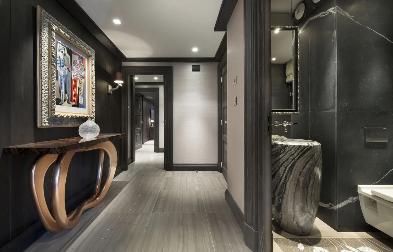 Exquisite décor blending dark woods, polished stone and unique furnishings