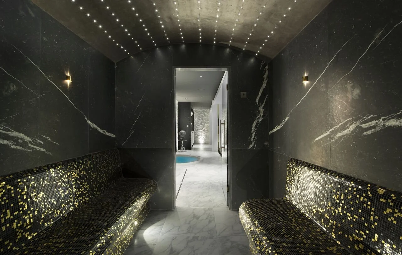 In the principal open-plan living and dining room, a contemporary fireplace takes centre stage. Rich fabric tones and dark timber hues contrast with the pale wall and floor finishes, creating an elegant and sumptuous entertaining space. Hand-crafted detailing of the chalet’s mountain location showcases the specialist, artisan trades and their workmanship. Special highlights are the bespoke forged and turned staircase plunging through five levels of the chalet and the bespoke designed balustrade of ‘frozen’ glass spindles cascading downwards like icicles, shimmering against the backdrop of a dark, beaded wallpaper. A large terrace wraps around the living area providing outdoor seating to take in the alpine scenery. The large master bedroom suite has been designed with comfort and lavishness in mind. The en-suite bathroom with the snowy whiteness of marble and the white gold mosaic accents create a classic backdrop for the inviting tub bath and the vanity unit, finished in Macassar ebony. The award winning home cinema has a sense of theatre and Deco design. This is a room in which to relax and be entertained. Wonderful bespoke wall panelling with fluted Deco motifs and upholstered furniture finished in rich, warm tones. Original Hollywood studio black and white photographic portraits from the 30s and 40s imbue the space with a mood of glamorous nostalgia. The basement of the chalet features a relaxing spa facility that includes a swimming pool, steam and sauna facilities, along with a gym and tranquil massage room.