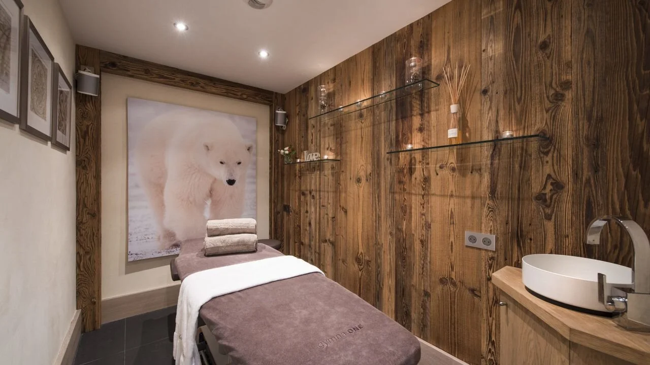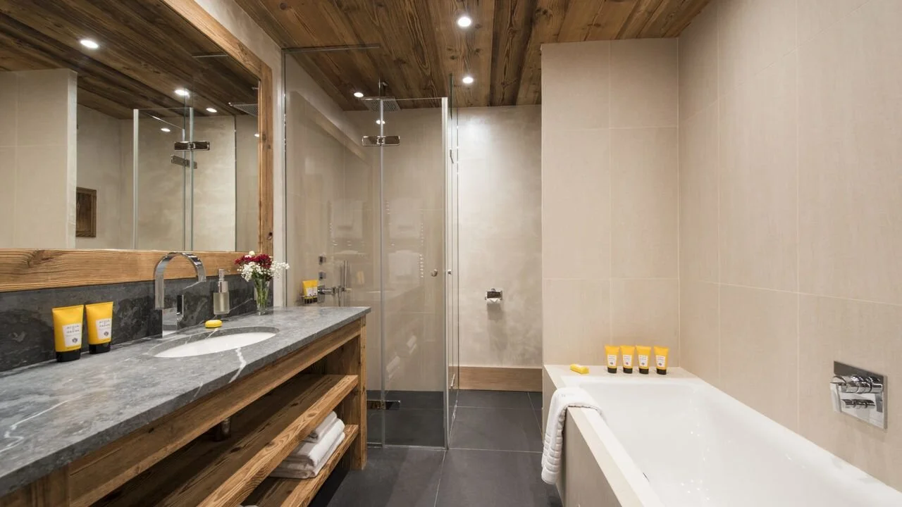 The chalet comfortably sleeps 12 guests in six spacious and well-appointed en-suite bedrooms. This chalet masterfully combines alpine contemporary chic with traditional local craftsmanship and natural materials. All the bedrooms have en-suite bathrooms with separate showers, gas fireplaces, and flat screen TVs. You will also find the games/TV room on this floor, an ideal space for entertaining all ages with Sky, Apple TV, PlayStation, a darts board, a bar, and a pool table. Adjacent to this room is a playroom, ideal for younger family members, with table football, TV, Wii, toys, and games.